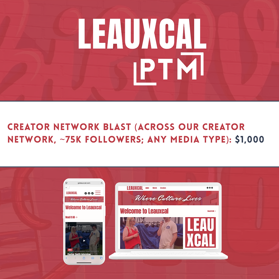 Leauxcal runs date-based campaigns. We keep pages clean with two in-article slots per post—Inline A (after ¶2) and Inline B (~60% down)—so a max of two advertisers run at once; if full, we book the next start date. Weekly buys run Mon–Sun and appear on each new post plus weekend reruns. Specs: 300×250 or 400×300 JPG/PNG/GIF ≤150 KB (GIF ≤15s, up to 3 loops); include a UTM click URL. Send creative to info@primetimemediala.com at least 2 business days before start; one swap/week included (extra swaps $25). Creator collabs/Blast are clearly labeled Sponsored/#ad; Leauxcal may repost/embed for 30 days. We send a short recap within 7 days; editorial is independent and we may decline unsuitable creatives. Payment due before start; cancel ≥48 hours pre-start for full credit; if we under-schedule your weekly insertions, we extend your flight. We can design static ad creative for a small additional fee. To book, email info@primetimemediala.com with your package and dates.